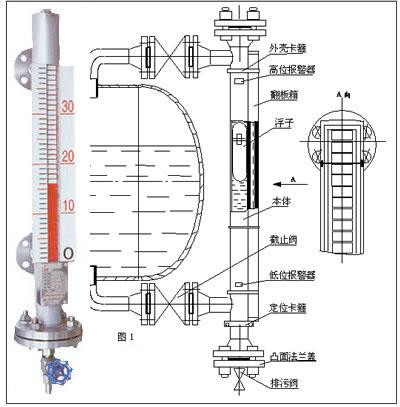 液位計采用連通器的原理。使容器內液體等高引入到液位計主體管內。在主體管內的漂浮浮球組件,根據浮力原理和磁性藕合原理。在主體管外附靠著能反映磁現象的翻柱作為液面位置的顯示。隨文體管內液位的變化,浮球組件的高低也相應變化。從而使主體管外的翻柱作180度的翻轉,當液位上升時,翻柱由白色轉為紅色,當液面下降時,翻柱由紅色轉為白色。顯示器的紅,白界位處為容器內介質液位的實際高度。從而實現液面的檢測目的如下圖所示。