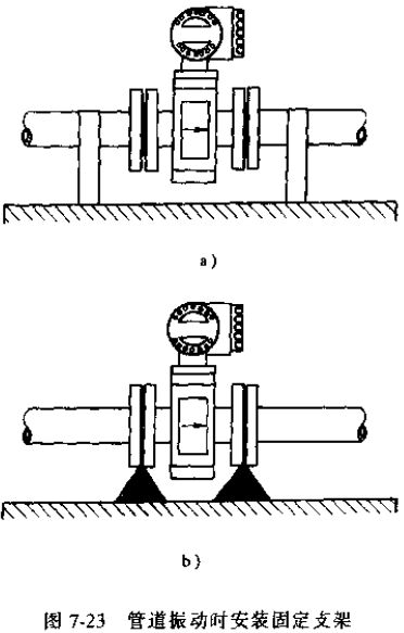6)安裝在無振動(dòng)或振動(dòng)小的場(chǎng)所。如果振動(dòng)過大,則應(yīng)在傳感器前后的管道加固定支撐,如圖7-23所示。