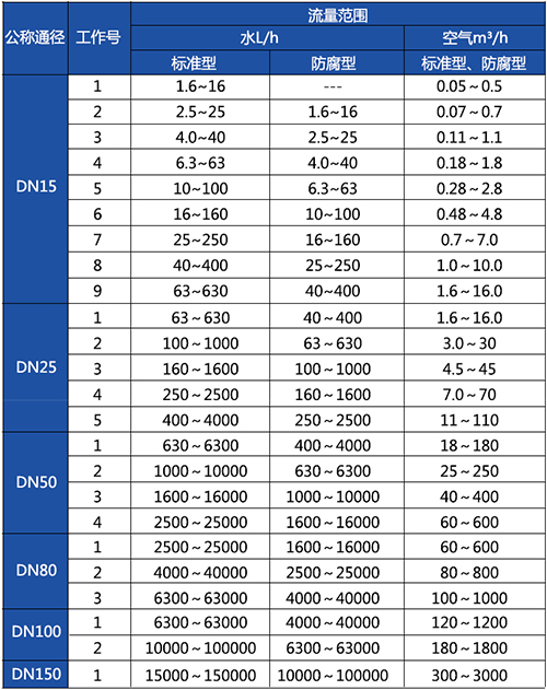 金屬浮子流量計流量范圍表