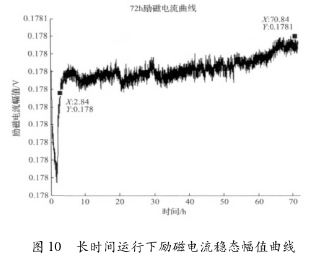 由圖可知,勵磁系統在上電工作后需要大約2,h進行預熱,隨后勵磁電流進入穩態,系統工作穩定。不考慮系統預熱過程,由采集得到的勵磁電流數據計算可得勵磁電流在72h內的波動率約為0.0156%,從而表明該勵磁系統在長時間運行下能夠可靠穩定工作。