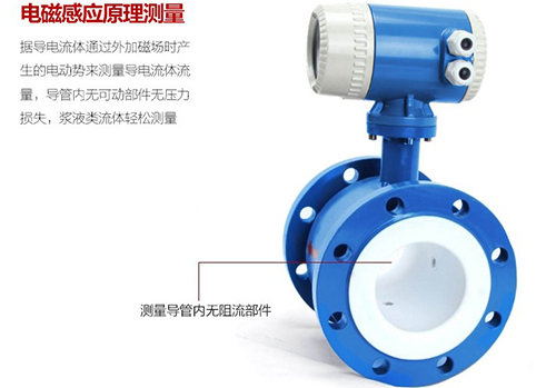 電磁流量計的工作原理是基于法拉*電磁感應定律。在流量計中,測量管內的導電介質相當于法拉*試驗中的導電金屬桿,上下兩端的兩個電磁線圈產生恒定磁場。當有導電介質流過時,則會產生感應電壓。管道內部的兩個電極測量產生的感應電壓。測量管道通過不導電的內襯(橡膠,特氟隆等)實現與流體和測量電極的電磁隔離,如圖所示。