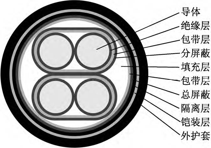 該新型電纜的結(jié)構(gòu)如圖1所示。導(dǎo)體為單股退火鍍錫軟銅線,以提高導(dǎo)體的導(dǎo)電性和防腐蝕性。在導(dǎo)體外繞包一層薄F4(聚四氟乙烯)半導(dǎo)電帶,有利于降低導(dǎo)體和絕緣之間的摩擦起電噪音。絕緣采用材料較為純凈、介電常數(shù)較小、具有一定彈性的聚丙烯絕緣級(jí)材料,并采用擠壓式擠出,減小絕緣層與導(dǎo)體的間隙。采用對(duì)絞組作為信號(hào)傳輸線,由于在兩根傳輸線上感應(yīng)的電壓接近相等,減小了電壓差值,提高了信號(hào)傳輸穩(wěn)定性;對(duì)絞組由兩種不同顏色絕緣線芯組成,相鄰線對(duì)對(duì)絞節(jié)距應(yīng)不大于100mm。對(duì)絞分屏蔽組(即對(duì)對(duì)絞組進(jìn)行分屏蔽,每對(duì)對(duì)絞組外繞包兩層聚酯帶和一層厚0.04mm鋁塑復(fù)合帶繞包,內(nèi)置一根7×0.26mm鍍錫銅絞線作引流線)有利于對(duì)不同對(duì)絞組之間信號(hào)串音的抑制和隔離。對(duì)絞分屏蔽組同心式絞合成纜,在對(duì)絞分屏蔽組間填充非吸濕性材料,以保證纜芯圓整。在成纜纜芯外繞包兩層聚酯帶,再采用鋁塑復(fù)合帶繞包,內(nèi)置鍍錫銅線作引流線,以提高電纜電磁屏蔽能力。總屏蔽層外擠包隔離層(隔離護(hù)套),隔離層采用絕緣級(jí)低密度聚乙烯材料。隔離層外采用鎧裝層,鎧裝材料為高導(dǎo)磁合金鋼帶,其為強(qiáng)磁材料,可將外來(lái)的磁通大部分限制在鎧裝層的外表面上(僅有少部分能進(jìn)入被屏蔽的空間);鎧裝時(shí)對(duì)高導(dǎo)磁合金鋼帶采用縱包焊接,確保其形成一連續(xù)圓柱管;鎧裝層可提高電纜抗電磁干擾水平以及對(duì)電纜進(jìn)行加強(qiáng),減少電纜振動(dòng)引起的電動(dòng)勢(shì)。外護(hù)套采用藍(lán)色軟PVC(聚氯乙烯)護(hù)層級(jí)電纜材料擠包,實(shí)現(xiàn)電纜防護(hù)。