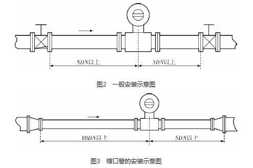 油田污水流量計廠家的安裝質量對其測量結果的影響較大,因此在安裝時需要注意幾個問題。*先,油田污水流量計廠家直管段的選擇在配管時一定要按照要求進行選擇,一般選擇流量計通徑與工藝管道通徑相同,即可滿足工程需要,而且安裝方便、壓力損失小,流量計直管段上游側的長度不少于5倍工藝管道直徑,下游側的長度不少于3倍工藝管道直徑(圖2)。但在流速太慢而又要求精度較高或需要變徑的應用場合,可選擇通徑小于工藝管道通徑的流量計,以提高測量精度,此時流量計上、下游必須加裝異徑管,且進口異徑管上游側應有長于10倍工藝管道直徑的直管段,下游側應有長于5倍工藝管道直徑的直管段(圖3)。