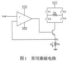 以往的激磁電路的設計都是采用恒流源和可控開關電路組成。恒流源是由電壓基準、比較放大、控制調整和采樣等部分組成的直流負反饋自動調節系統,常用的激磁電路就是用串聯調整型恒流電源盒控制開關組成的,如圖1。其中Vref是參考電壓,Rs是采樣電阻,Is為流過Rs的電流,就是所需的恒流,RL為電磁流量傳感器線圈,K1、K2、K3、K4為可控開關,以達到使線圈RL中流經正負交換的電流,對傳感器激磁。