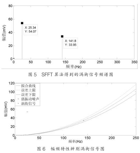 從圖 5 可以看出 SFT 算法能夠很好恢復,對渦街信號的頻率恢復沒有誤差,而幅值的誤差不超過 1% ,這對含有強振動噪聲的渦街信號精確測量至關重要;圖 6 是經 SFT 頻譜分析所得到的數據通過幅頻特性曲線來辨別是噪聲信號還是渦街信號。通過幅頻關系的信號處理方法可以從含有振動的混合信號中識別渦街信號,從而達到提高氯氣流量計抗振動性能的目的。