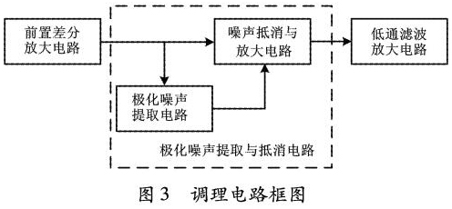 根據前饋控制的自適應*化噪聲抵消原理,設計了信號調理電路2,以實現*化噪聲的濾除。信號調理電路2主要包括前置差分放大電路、*化噪聲提取與抵消電路、低通濾波放大電路三部分。調理電路如圖3所示。