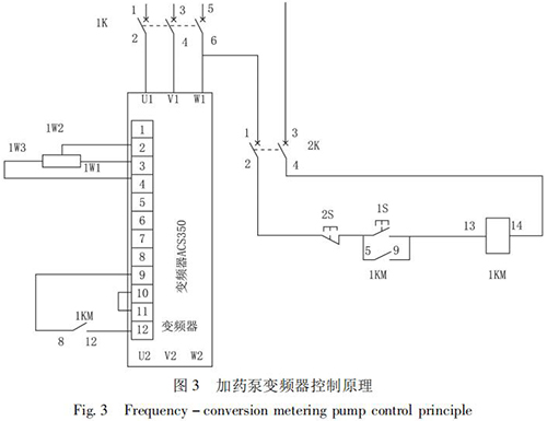 STD - Ⅲ型浮選工藝參數自動測控系統通過雙膜盒差壓計測量原礦漿濃度; 采用地下水污水流量計測量原礦漿流量,由 PLC 計算出入浮干煤泥量和藥劑的瞬時添加量,用變頻式計量泵完成浮選藥劑的添加。通過上位機還可以打印小時、班、天及月的運行數據,更加有利于生產管理及技術分析,藥劑自動原理如圖 2 所示,k1、k2、k3 是計算修正參數。以 PID 算法為核心,通過優化控制程序計算出藥劑給定量,在捕收劑和起泡劑管道上分別安裝藥劑測量裝置,用于檢測藥劑的添加量。當藥劑測量值小于藥劑給定量時,PID 輸出增大,反之則減小。加藥泵變頻器控制原理如圖 3 所示。