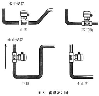 現(xiàn)場安裝時應(yīng)注意遠(yuǎn)離可能對其產(chǎn)生干擾的大型設(shè)備,防止長期的熱輻射和其他如磁場直射等環(huán)境影響。為確保高測量精度和較好的零點(diǎn)穩(wěn)定性,進(jìn)行校正前,智能型電磁流量計(jì)應(yīng)裝入工藝介質(zhì)中至少 24 小時電*鈍化。安裝的管路設(shè)計(jì)應(yīng)確保管道始終充滿流體,防止測量誤差,管路設(shè)計(jì)圖見圖 3。