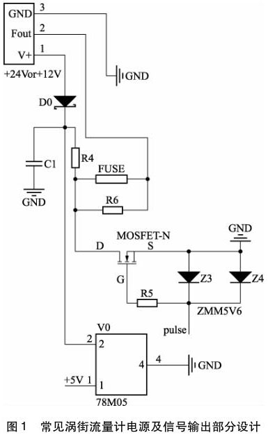 從圖1 中可以看到,供電電源 +24 V, +12 V均可,直流電源通過瓷片電容 C1 濾掉部分紋波,然后通過線性穩壓芯片 78M05,得到 + 5 V 電壓,為后面的流量計信號處理電路供電,若要再得到 3. 3 V 電壓,通常會在 78M05 后再加一片線性穩壓芯片 LM1117-3. 3,為了節約成本,供電電路沒有做 EMS 設計。同時,脈沖輸出部分,僅通過一個 MOS 管和兩個穩壓管,也沒有 EMS 方面的設計考慮。
