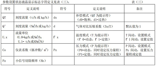 (3)標(biāo)況流量計(jì)算公式(若補(bǔ)償后單位為 U.0):(4)標(biāo)況流量計(jì)算公式(若補(bǔ)償后單位為 U.1):注:標(biāo)況指 20℃,1 標(biāo)準(zhǔn)大氣壓三、一體化液晶顯示表頭參數(shù)設(shè)置操作說(shuō)明(V03Z)1、鍵盤按鍵說(shuō)明2、 顯示窗字符說(shuō)明注:表中 x 代表“0”或“1”;Zn:標(biāo)準(zhǔn)狀態(tài)下(20℃,1 標(biāo)準(zhǔn)大氣壓),被測(cè)氣體的壓縮系數(shù),Z:工作狀態(tài)下被測(cè)氣體的壓縮系數(shù)3、 操作說(shuō)明3.1、本儀表表頭采用自導(dǎo)引式和菜單式相結(jié)合的參數(shù)設(shè)置方式,所謂自導(dǎo)引式參數(shù)設(shè)置方式就是用戶在進(jìn)入菜單 00 項(xiàng)后,表頭中的微電腦會(huì)自動(dòng)導(dǎo)引用戶去設(shè)置需要設(shè)置的參數(shù)。另外,用戶也可以通過(guò)菜單模式分別對(duì)各組參數(shù)進(jìn)行設(shè)置。蒸汽測(cè)量菜單框圖如下:3.2、參數(shù)設(shè)置約定:在設(shè)置各項(xiàng)參數(shù)時(shí),提示符閃動(dòng)代表該項(xiàng)參數(shù)沒(méi)有設(shè)置完或者尚未確認(rèn),可以通過(guò)按SET 鍵來(lái)確認(rèn)或者按→鍵退出;提示符不閃動(dòng)代表該項(xiàng)參數(shù)已設(shè)置完并確認(rèn),此時(shí)可以通過(guò)按 SET 鍵翻頁(yè)或者按→鍵退出。進(jìn)入?yún)?shù)設(shè)置時(shí),需要輸入密碼(6 位)并確認(rèn)進(jìn)入,為了防止誤進(jìn)入?yún)?shù)設(shè)置菜單,保證儀表正常工作,在設(shè)置密碼時(shí),使用↑鍵調(diào)數(shù)時(shí)不能循環(huán)調(diào)數(shù),只能單次調(diào)數(shù),只有密碼輸入正確進(jìn)入各項(xiàng)參數(shù)設(shè)置菜單后才可以對(duì)各位循環(huán)連續(xù)調(diào)整數(shù)據(jù)。3.3、儀表參數(shù)設(shè)置舉例:儀表出廠前各項(xiàng)參數(shù)已設(shè)置好,用戶無(wú)需設(shè)置。如果用戶需要設(shè)置某項(xiàng)參數(shù),請(qǐng)參照以下步驟,例如修改刻度流量值 QT:在工作狀態(tài)下,按 SET 鍵,顯示屏顯示 P,數(shù)字位為全零,8 秒鐘若無(wú)操作,自動(dòng)返回工作狀態(tài)。輸入密碼 :按數(shù)字↑鍵和左移←鍵,輸入密碼數(shù) xxxxx(出廠時(shí)默認(rèn)密碼為 000123),↑鍵調(diào)各位數(shù)字 0-9,每按 ←鍵一次數(shù)字向右循環(huán)一位,可通過(guò)多次按←鍵對(duì)整段數(shù)字清零,按→鍵可以返回工作狀態(tài)。菜單選擇項(xiàng):按 SET 鍵確認(rèn),顯示屏顯示如右圖所示,末行“00”閃動(dòng)調(diào)整該項(xiàng)值選擇不同參數(shù)設(shè)置菜單。該例直接按 SET 鍵進(jìn)入菜單 00 項(xiàng)設(shè)置刻度流量:QT 閃動(dòng),*一步:*先進(jìn)行小數(shù)點(diǎn)調(diào)整,可以通過(guò)←鍵對(duì)參數(shù)快速清零或者通過(guò)↑鍵進(jìn)行小數(shù)點(diǎn)調(diào)整,調(diào)整完畢,按 SET 鍵確認(rèn)(QT 仍閃動(dòng));*二步:數(shù)值調(diào)整,可以通過(guò)↑鍵對(duì)每位數(shù)字進(jìn)行調(diào)整,按 ←鍵一次數(shù)字向右移動(dòng)一位,調(diào)整完畢,按 SET 鍵確認(rèn),QT 停止閃動(dòng),該項(xiàng)參數(shù)設(shè)置完畢,可進(jìn)行下一項(xiàng)參數(shù)設(shè)置或者退出另外,單位設(shè)置 U.X 和補(bǔ)償方式設(shè)置 dX 通過(guò)↑鍵調(diào)整修改。3.4、校驗(yàn)項(xiàng)說(shuō)明: 儀表出廠前,溫度和壓力通道已校驗(yàn)設(shè)置好,無(wú)需用戶重新校驗(yàn)。校驗(yàn)通道有密碼保護(hù),廠家不對(duì)外開(kāi)放,如果需要重新校驗(yàn)溫度或者壓力通道,請(qǐng)專業(yè)人員與廠家技術(shù)人員聯(lián)系。4、計(jì)算公式說(shuō)明4.1、蒸汽測(cè)量計(jì)算公式(1)渦街流量?jī)x表工況體積流量計(jì)算公式:(2)密度 d,單位 Kg/m3(3)質(zhì)量流量計(jì)算公式,單位 Kg/h:(4)質(zhì)量流量計(jì)算公式,單位 t/h:4.2、氣體測(cè)量計(jì)算公式----標(biāo)況指 20℃,1 標(biāo)準(zhǔn)大氣壓(1)渦街流量?jī)x表工況體積流量計(jì)算公式:(2)對(duì)比壓縮系數(shù) d(Zn/Z),單位 1(3)標(biāo)況流量計(jì)算公式,單位 Nm3/h:P1—工況絕壓,PN—標(biāo)況絕壓(Mpa),T1—工況熱力學(xué)溫度,TN—標(biāo)況熱力學(xué)溫度(K)