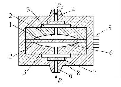 1—金屬膜片(動*);2—凹玻璃圓盤;3—金屬鍍層(定*);4—低壓側(cè)導(dǎo)壓口;5—輸出端子;6—空腔;7—過濾器;8—殼體;9—高壓側(cè)導(dǎo)壓口