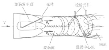 在入口側安放一組螺旋型導流葉片,當流體進入流量傳感器時,導流葉片迫使流體產生劇烈的旋渦流。當流體進入擴散段時,旋渦流受到回流的作用,開始作二次旋轉,形成陀螺式的渦流進動現象。該進動頻率與流量大小成正比,不受流體物理性質和密度的影響,檢測元件測得流體二次旋轉進動頻率就能在較寬的流量范圍內獲得良好的線性度。信號經前置放大器放大、濾波、整形轉換為與流速成正比的脈沖信號,然后再與溫度、壓力等檢測信號一起被送往微處理器進行積算處理,*后在液晶顯示屏上顯示出測量值。