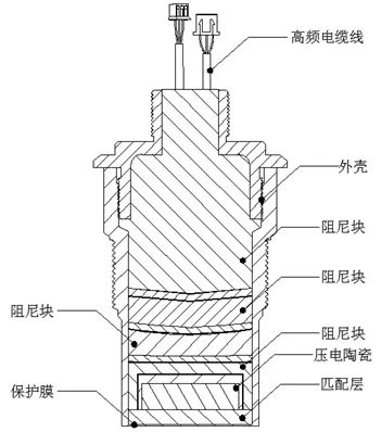 如上圖所示,超聲波液位計探頭的結構主要由壓電陶瓷、高頻電纜線、匹配層、阻尼塊、外殼、保護膜等部分組成。