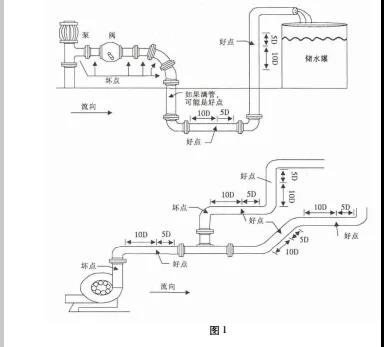 (2) 選點(diǎn)很重要,不滿足直管段要求會(huì)存在氣泡和擾動(dòng)流。安裝距離應(yīng)選擇上游大于 10 倍直管徑、下游大于 5 倍直管徑以內(nèi)無任何閥門、彎頭、變徑等均勻的直管段,安裝點(diǎn)應(yīng)充分遠(yuǎn)離閥門、泵、高壓電和變頻器等干擾源。直管段盡量越長越好,以盡可能的消除各種干擾。