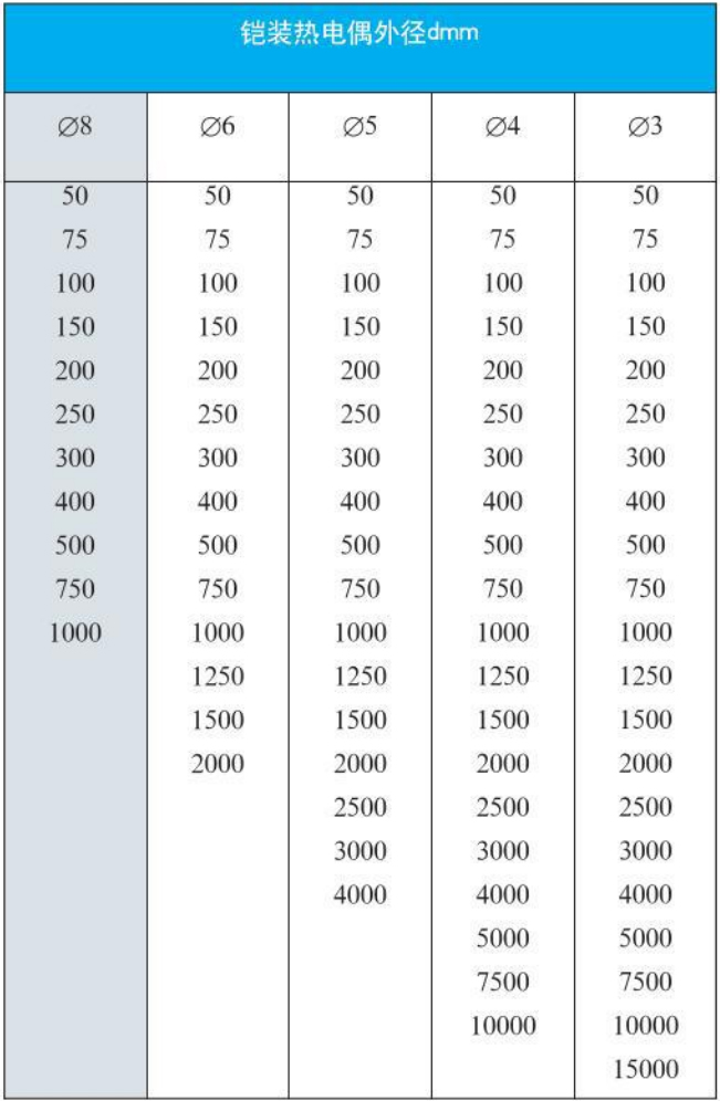③直徑φ2mm鎧裝熱電偶須和本公司協商訂貨。